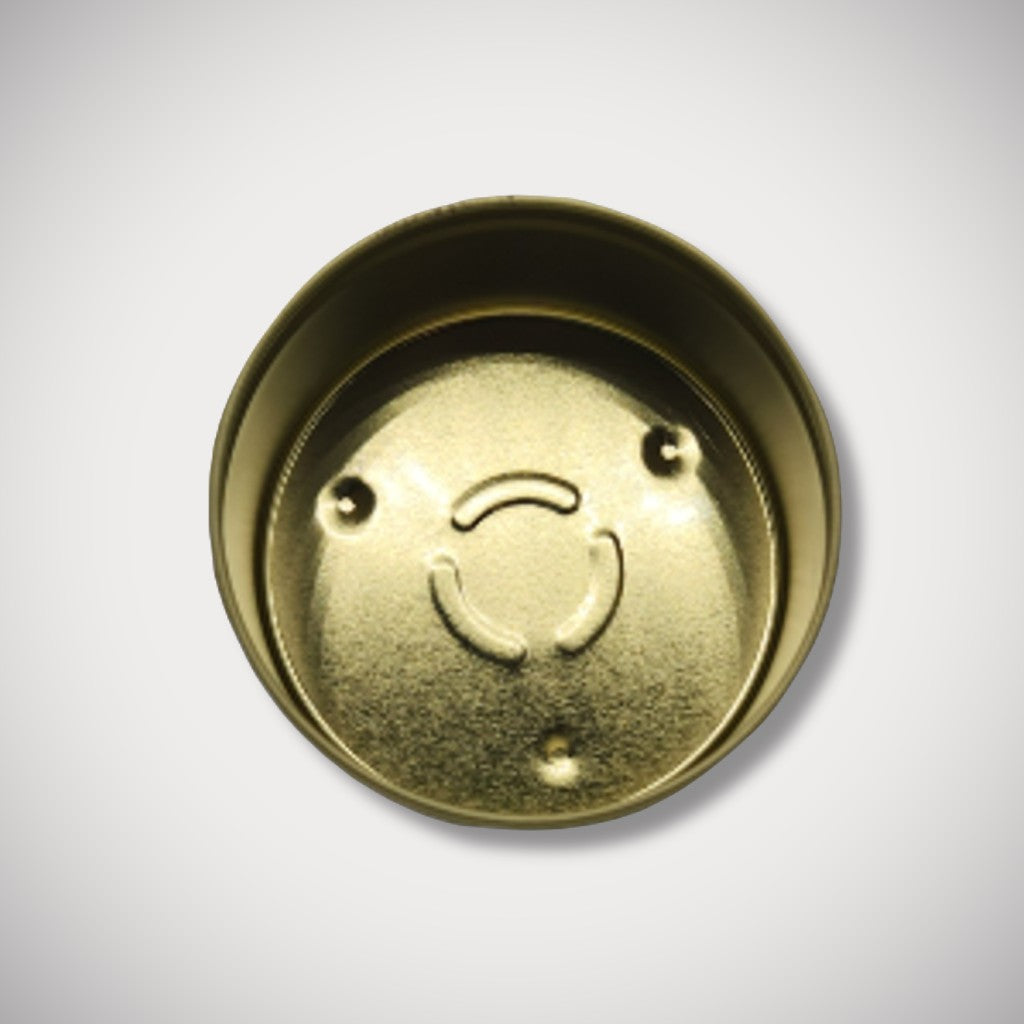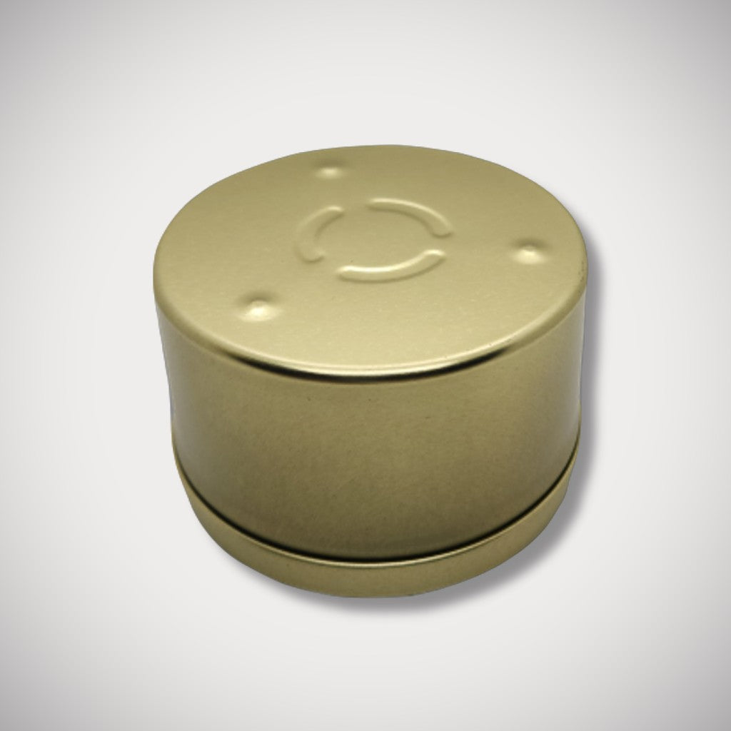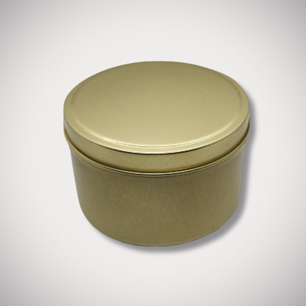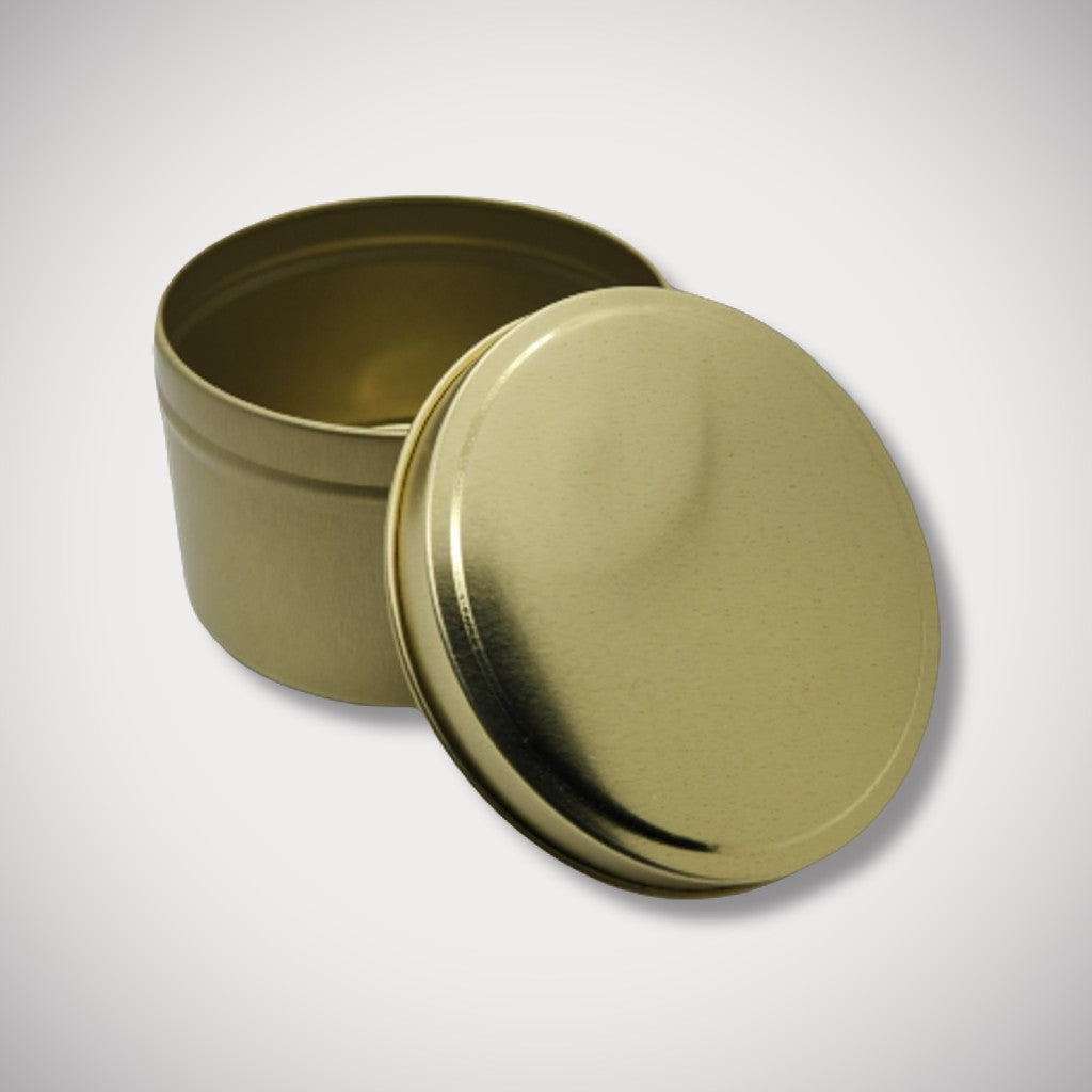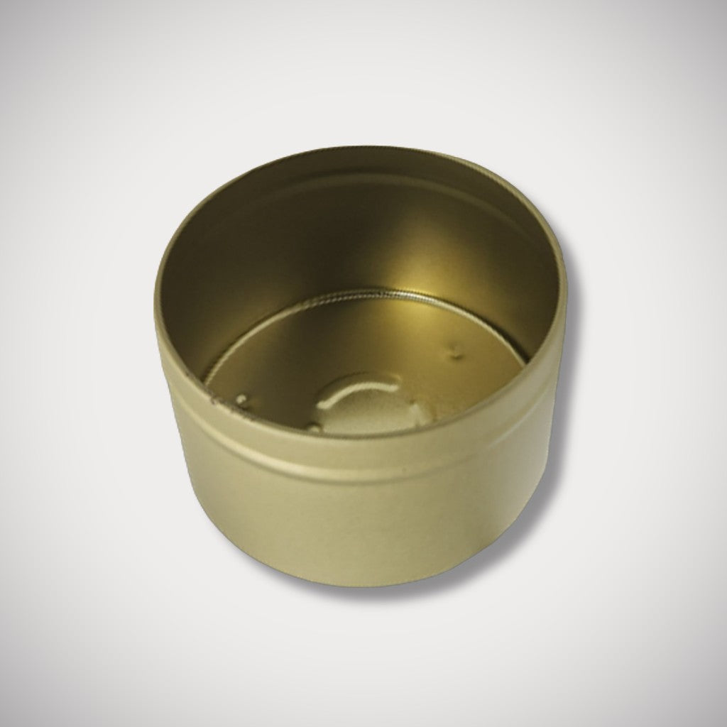 8oz tin for candle making in gold featuring raised feet, wick placement indent, and a rust proof coating